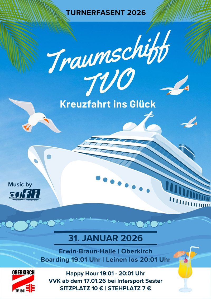 Unter dem Motto „TVO Traumschiff – Kreuzfahrt ins Glück“ lädt der Turnverein 1861 Oberkirch zu einer ganz besonderen Reise ein. Die Abteilungen des TVO haben ein buntes, abwechslungsreiches Programm auf die Beine gestellt, dass die Zuschauerinnen und Zuschauer tänzerisch, akrobatisch und turnerisch durch den Abend begleitet. Phantasievolle Choreografien, beeindruckende Turnvorführungen und kreative Programmpunkte sorgen für beste Unterhaltung an Bord. Ergänzt wird die Reise durch mitreißende Gastauftritte befreundeter Vereine, die das Traumschiff-Erlebnis perfekt abrunden. Freuen Sie sich auf eine abwechslungsreiche Fasentsveranstaltung voller Bewegung, Emotionen und turnerischer Vielfalt – eine Kreuzfahrt ins Glück mit dem TVO!